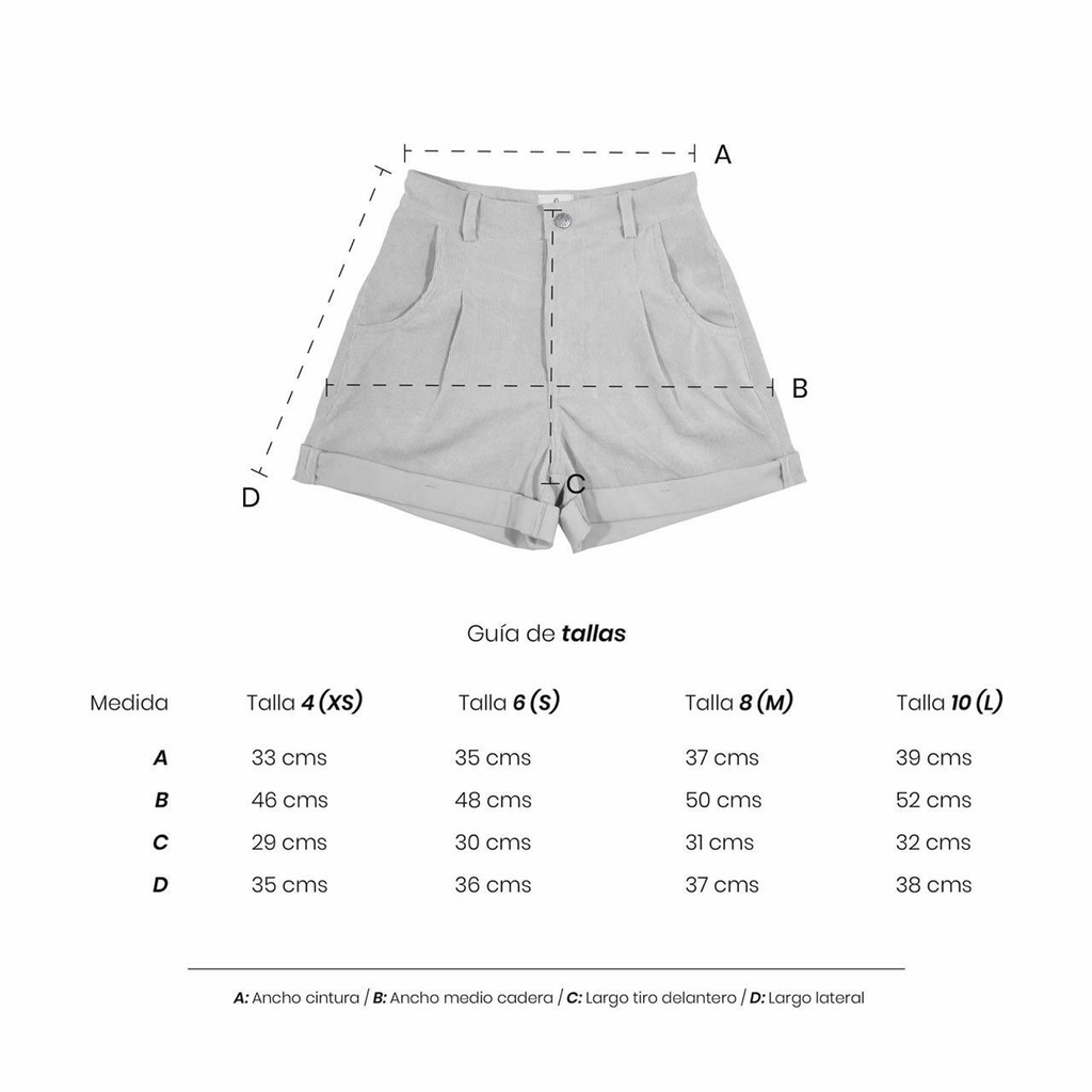 Short en tela corduroy acanalado (90 % poliéster, 9% nylon, 1% spandex) con silueta tipo "paperbag" (tiro alto entallado en la cintura y ancho en la cadera) en color beige, botones metálicos, bolsillos delanteros y laterales tipo invisibles.